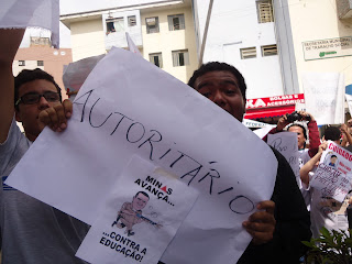 cartazes de protesto contra a presença do governador e a política de baixos salários